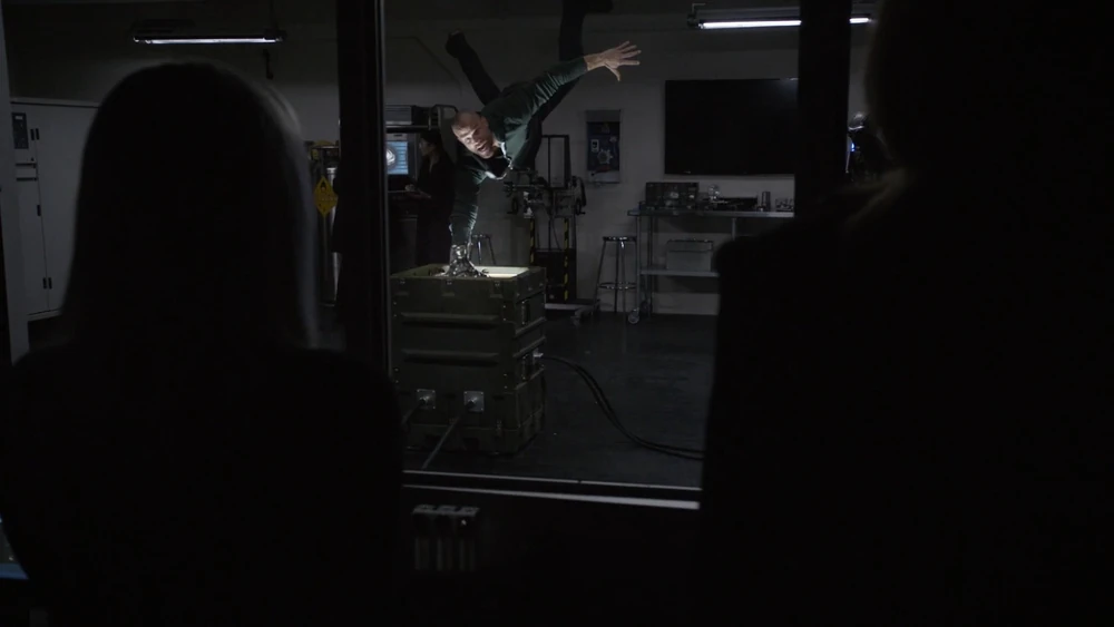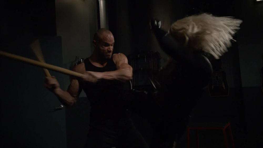 While Coulson and Talbot were making their escape using a teleporter device which HYDRA had taken, Creel and Ruby had continued their clash throughout the facility, ending up inside the gymnasium where Creel armed himself with a wooden stick. Ruby, however, immediately used her chakram to cut the stick in half, only for Creel to then use the sticks as his own billy clubs. As the pair continued to fight, Creel's considerable strength was outmatched by all Ruby's fighting ability as she managed to dodge his attacks and countered with impressive hits. When Creel did manage to kick Ruby away, she used this to her advantage by striking Creel with a dumbbell.